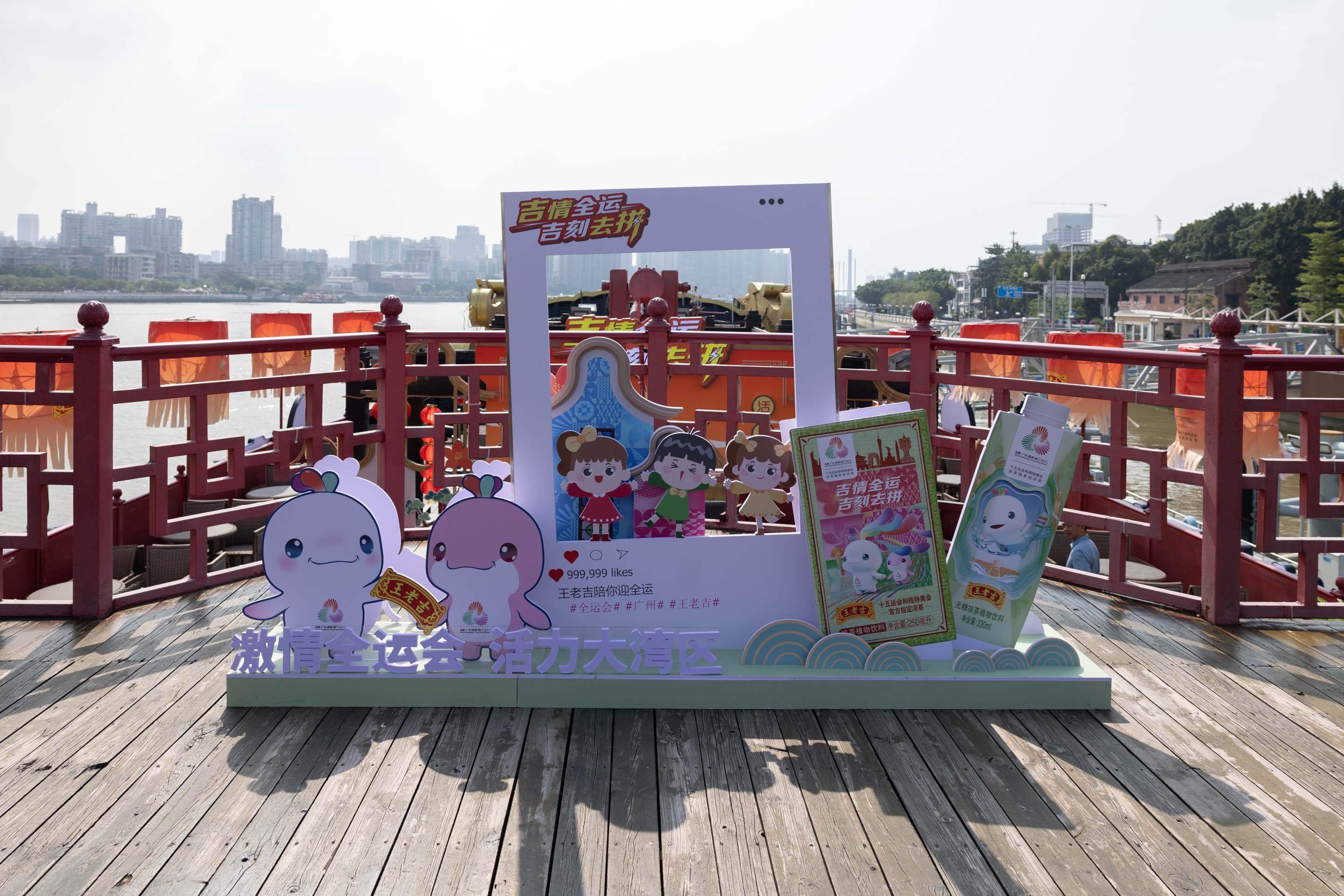 作为珠江上最先以全运会为主题实施全面升级改造的游船,该船以“吉情全运,吉刻去拼”为主题,船身精心装饰全运会口号、吉祥物“喜洋洋”“乐融融”,以及木棉花、王老吉全运特别款产品造型,尽显全运活力与岭南风情。室内设有“王老吉百年茶铺”“云山珠水·宫灯映华”联动主题展、全运倒计时墙和岭南风情打卡点,将全运精神、岭南文化与珠江美景巧妙融合。